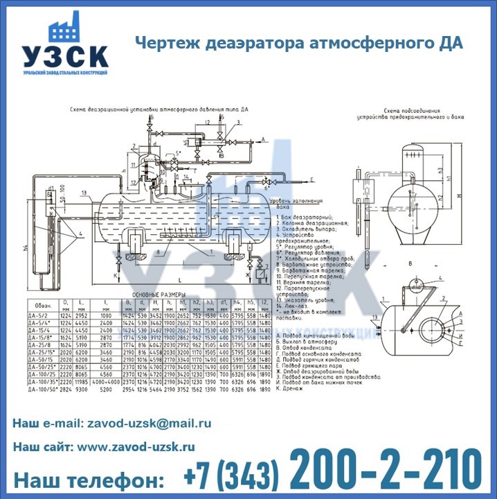 Приобрести качественное оборудование, в том числе, деаэраторы ДА, можно в компании УЗСК в Твери. Мы предлагаем долговечную и надежную продукцию по приемлемой цене. Заказать и купить деаэраторы или другие изделия высокого качества можно через сайт Уральского Завода Стальных Конструкций, или позвонив по указанному в разделе «Контакты» телефону.